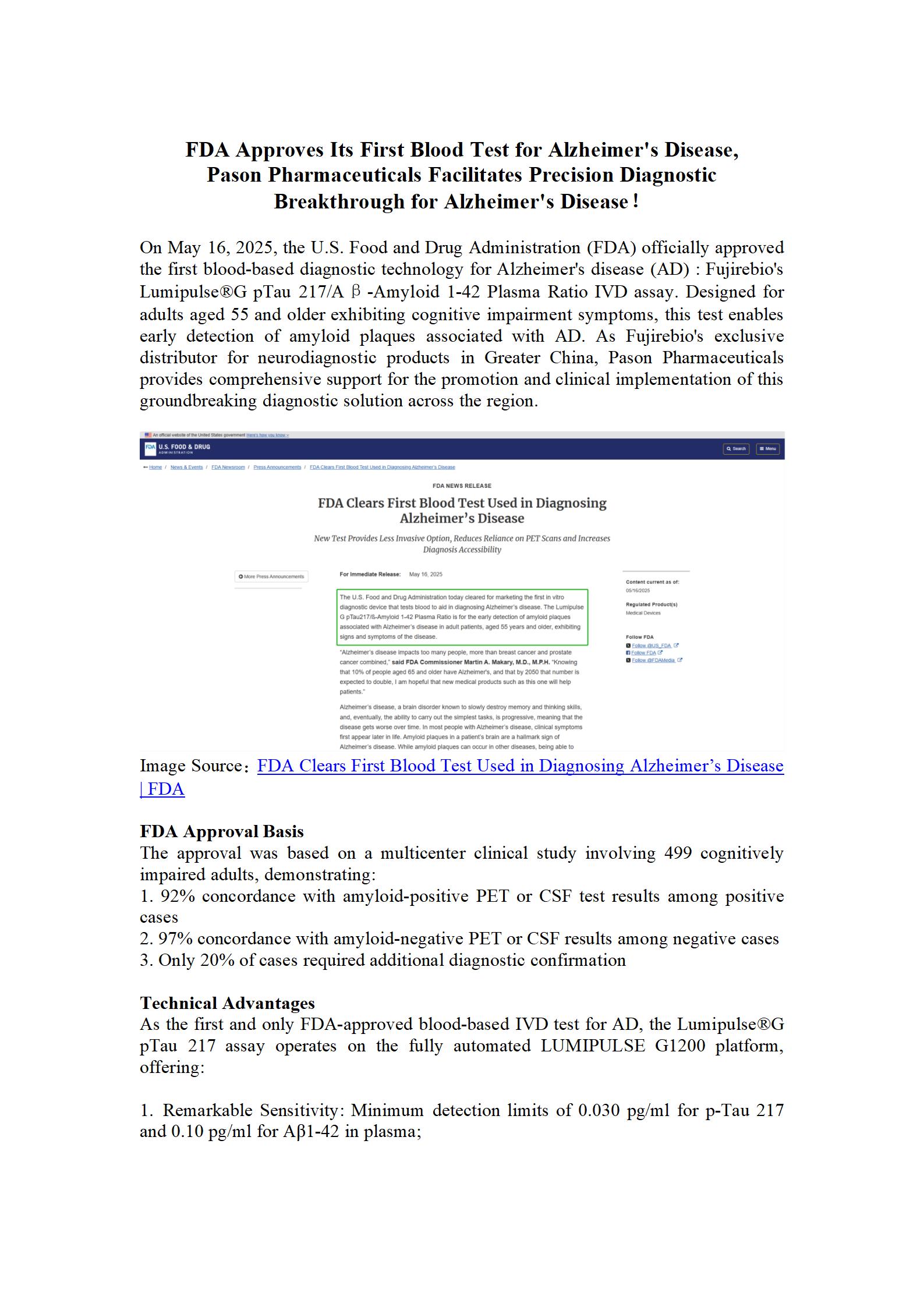 Beijing Pason Pharmaceuticals Inc. (Pason) was established in 2001 by a group of outstanding scientists and successful entrepreneurs. Over the past 24 years, adhering to the belief of "Search for truth, Be pragmatic and innovative", the company has always been committed to innovative research and development of early diagnosis and treatment of neurodegenerative diseases, infectious diseases, and cancers through cooperation with leading domestic and international research institutions, hospitals, and companies. Pason has been providing customers with world-class technologies and products, and its products and technologies have been widely used in clinical research in China on the etiology, pathogenesis, and therapeutic drugs of neurological disorders, infectious diseases, and cancers.